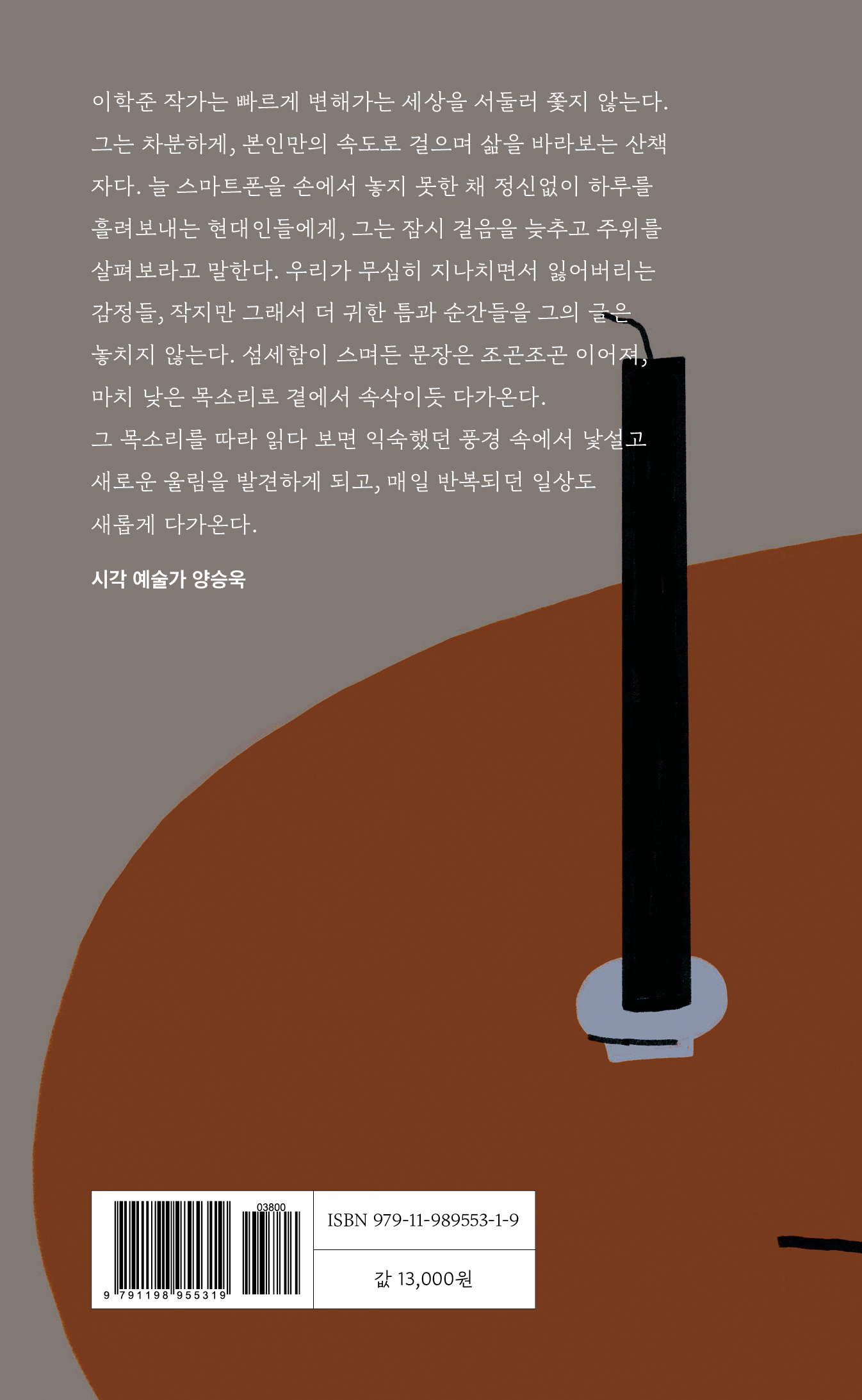 이학준 작가는 빠르게 변해가는 세상을 서둘러 쫓지 않는다. 그는 차분하게, 본인만의 속도로 걸으며 삶을 바라보는 산책자다. 늘 스마트폰을 손에서 놓지 못한 채 정신없이 하루를 흘려보내는 현대인들에게, 그는 잠시 걸음을 늦추고 주위를 살펴보라고 말한다. 우리가 무심히 지나치면서 잃어버리는 감정들, 작지만 그래서 더 귀한 틈과 순간들을 그의 글은 놓치지 않는다. 섬세함이 스며든 문장은 조곤조곤 이어져, 마치 낮은 목소리로 곁에서 속삭이듯 다가온다. 그 목소리를 따라 읽다 보면 익숙했던 풍경 속에서 낯설고 새로운 울림을 발견하게 되고, 매일 반복되던 일상도 새롭게 다가온다.